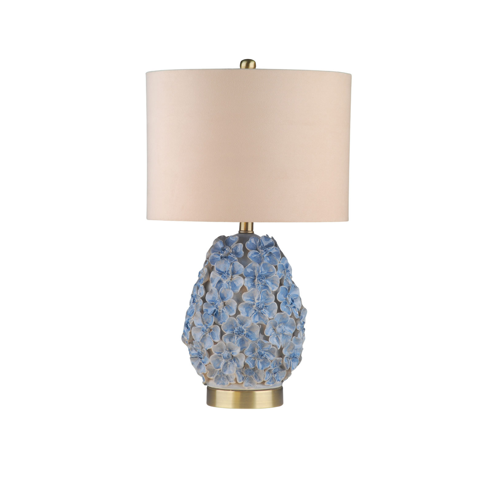 The Olivia Lamp is a charming decorative piece inspired by floral form. Its rounded ceramic base is adorned with delicate raised blossoms finished in soft blue tones that create a beautifully tactile surface. The organic detailing gives the lamp a romantic and artistic quality that feels both playful and refined.