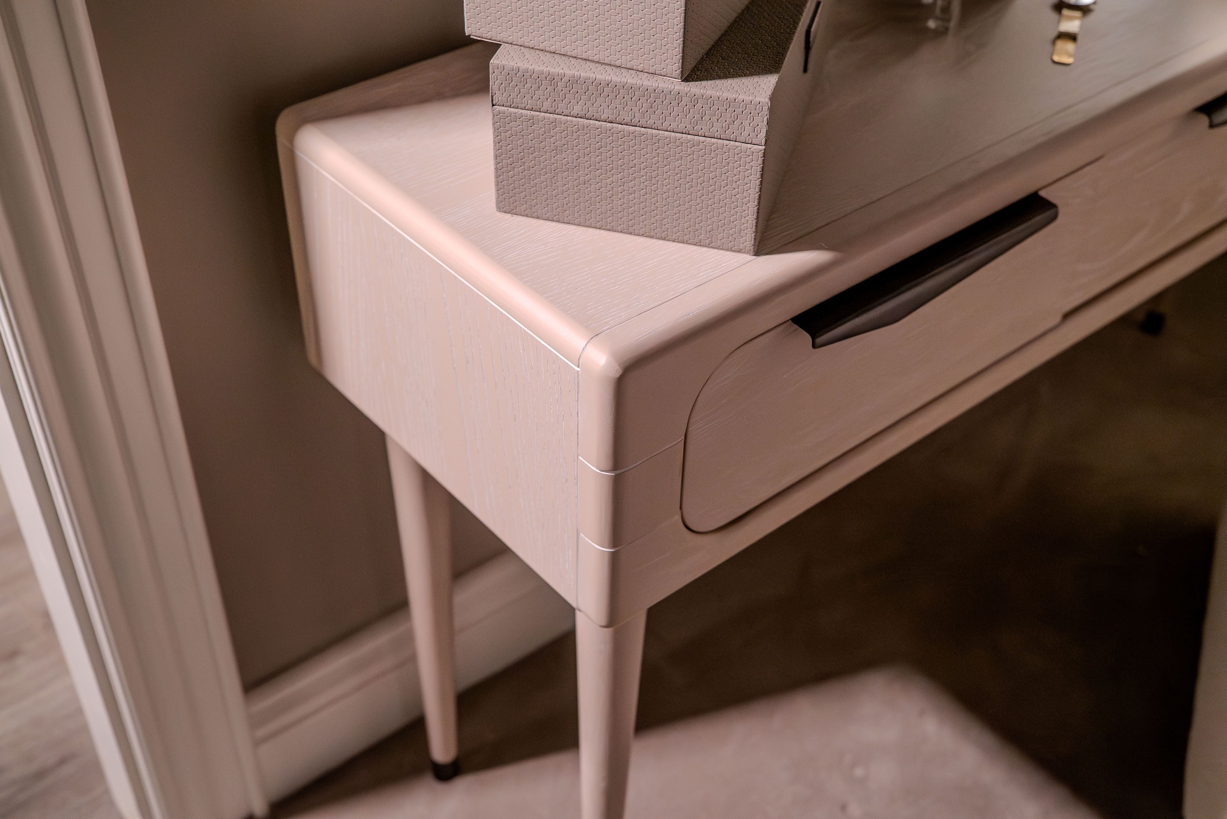 Elevate your entryway or living space with this beautifully designed console table. Featuring three drawers for organized storage, it is crafted from premium light oak wood with a smooth matte finish. The slim profile makes it ideal for narrow spaces like hallways, while the rounded corners and tapered legs give it a refined yet approachable look. Its black handles provide a modern contrast and add a touch of boldness. Use it as a display surface for decor or as a functional table for everyday essentials.